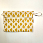 Als Übergang in die künstlerisch angewandte Sphäre fertigte Atelier LAV besondere textile Einzelstücke aus einem Rapport des ARTIFLECHT an. Der Rapport wurde mittels Siebdruck auf ungebleichten und ungefärbten Bio-Baumwollstoff mit reinen Naturfarben gedruckt. Diese textilen Stücke sind absolute Einzelstücke und entstanden komplett plastikfrei aus nur maximal drei Materialien: unbehandelter Baumwolle, Metall und Naturfarben. Als Druckfarben verwendete Atelier LAV Kurkuma-Gelb und Indigo-Blau, stellvertretend für den wundervollen natürlichen Färbevorgang mit Kurkuma und Indigo.
