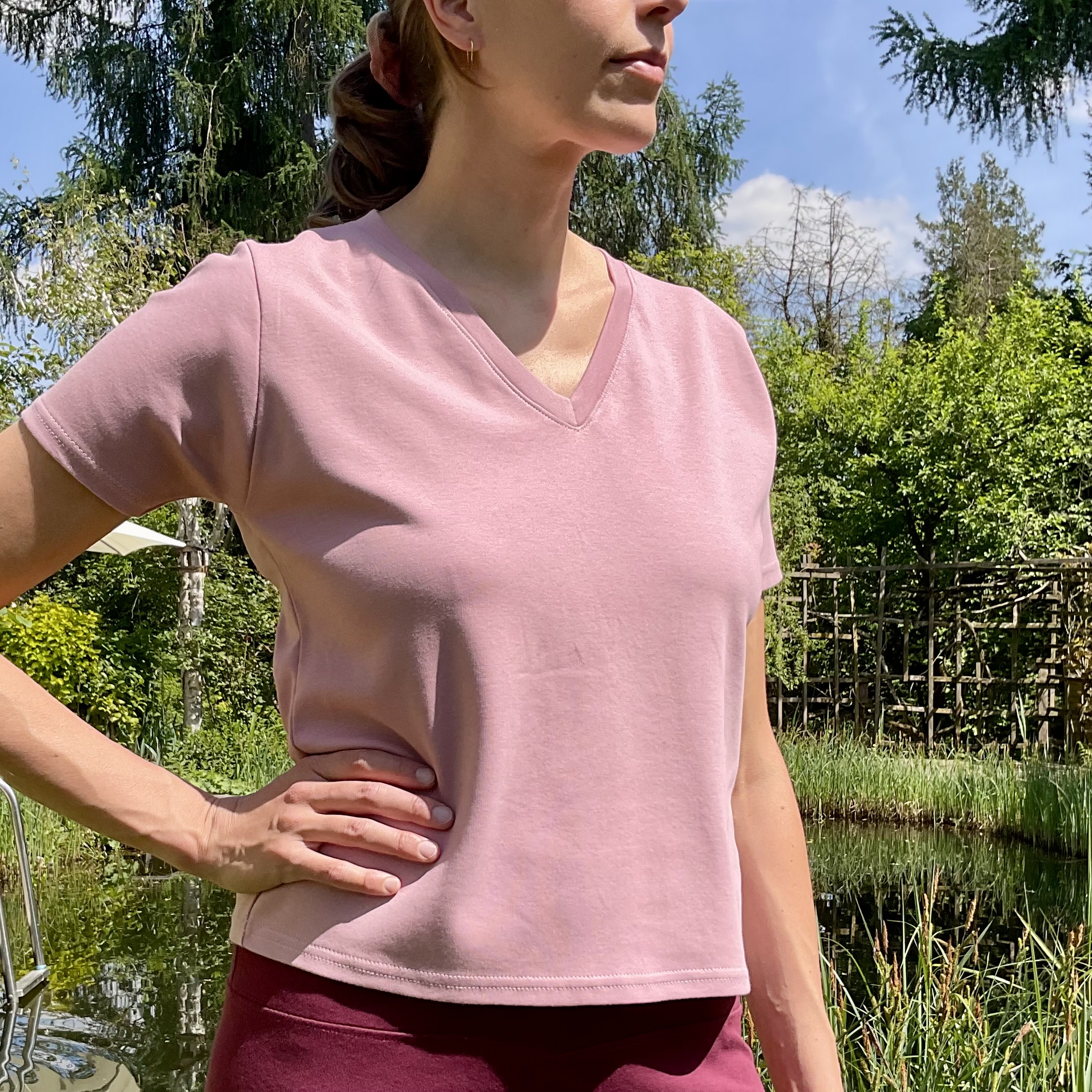 Ein anliegendes und individuell angepasstes Top mit V-Rückenausschnitt.